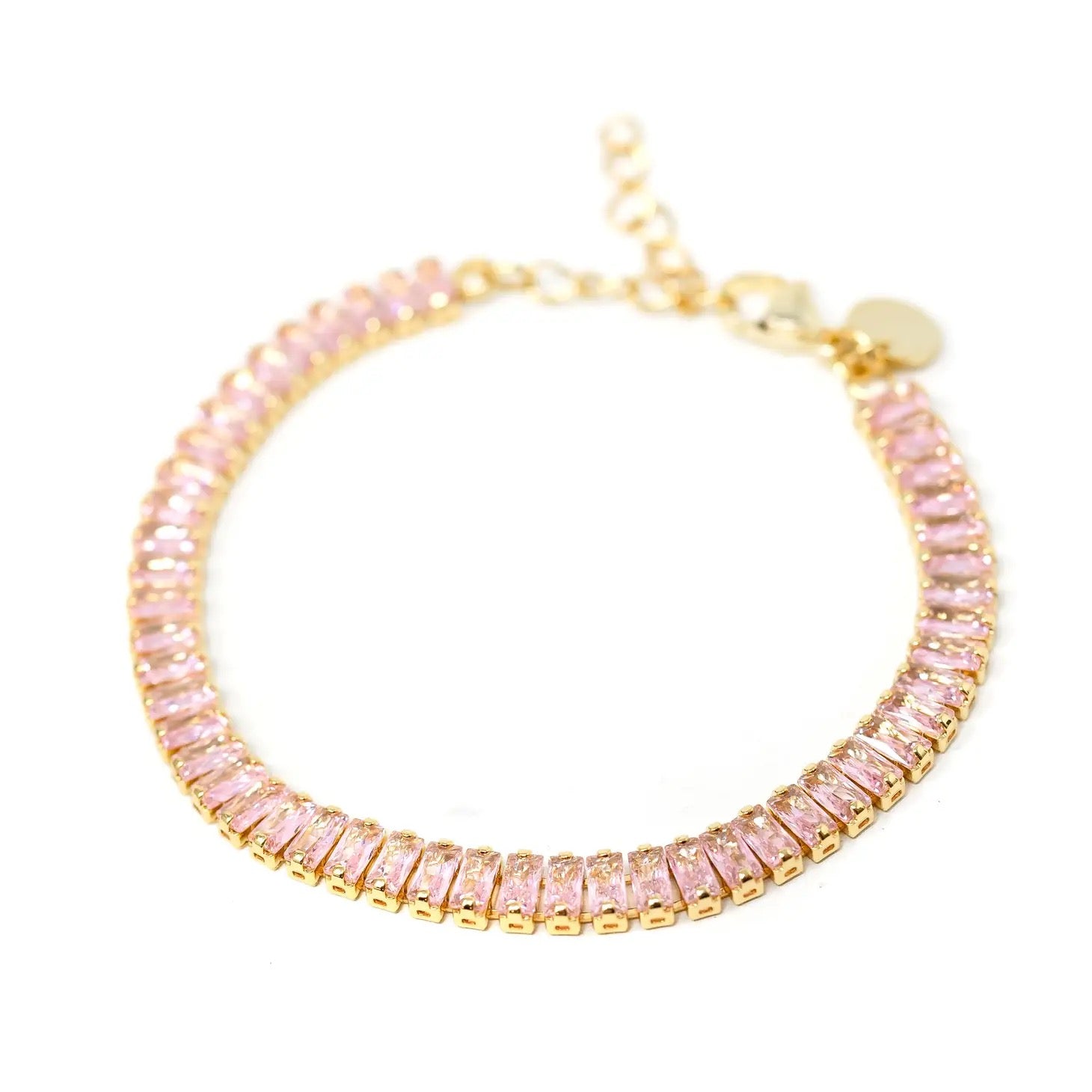 Elevate your style with our exquisite Pink Baguette Bracelet in stunning gold hardware. The intricate lobster claw clasp adds a touch of sophistication to this luxurious piece.